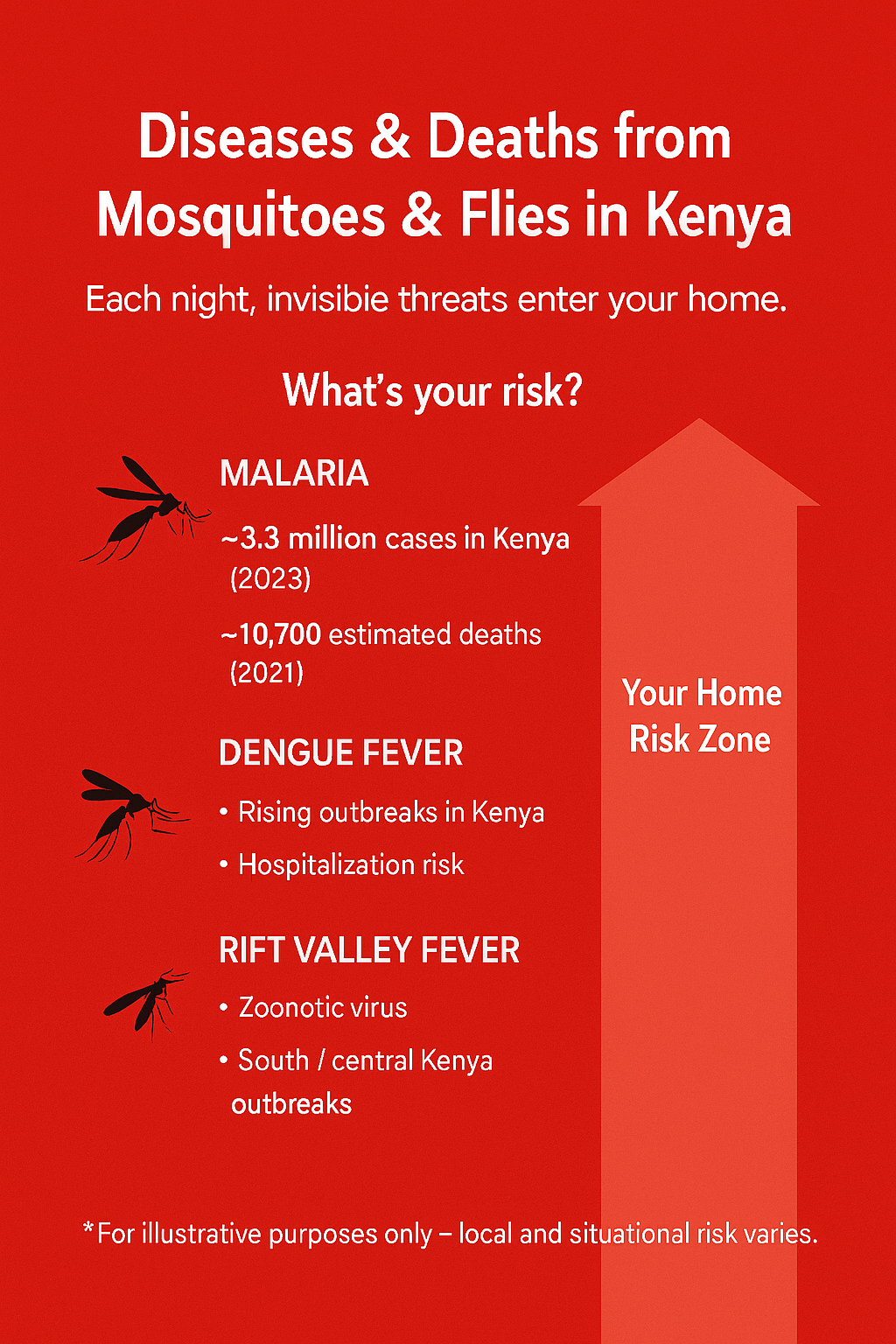 Every night you leave your home vulnerable. A single mosquito, fly, or insect bite can be the gateway to disease, suffering, and even death. Rural areas, informal settlements, and humid regions of Kenya are especially prone.